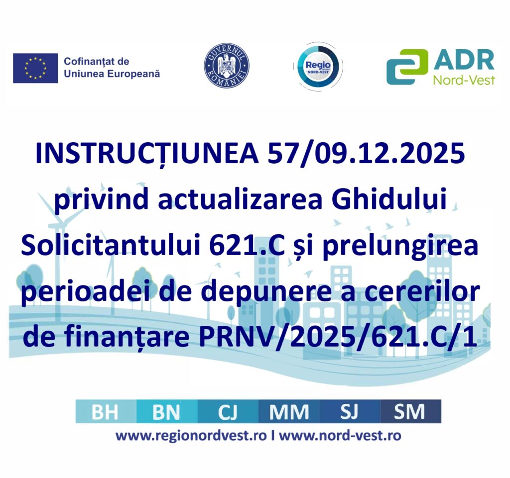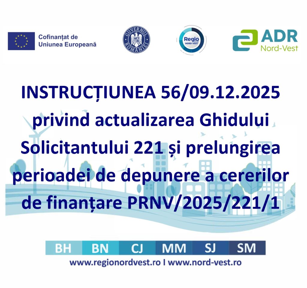 INSTRUCȚIUNEA 56/09.12.2025 privind actualizarea Ghidului Solicitantului 221 și prelungirea perioadei de depunere a cererilor de finanțare pentru apelul de proiecte PRNV/2025/221/1 „Înființarea și operaționalizarea Centrului Regional de Date Nord-Vest”decembrie 9, 2025