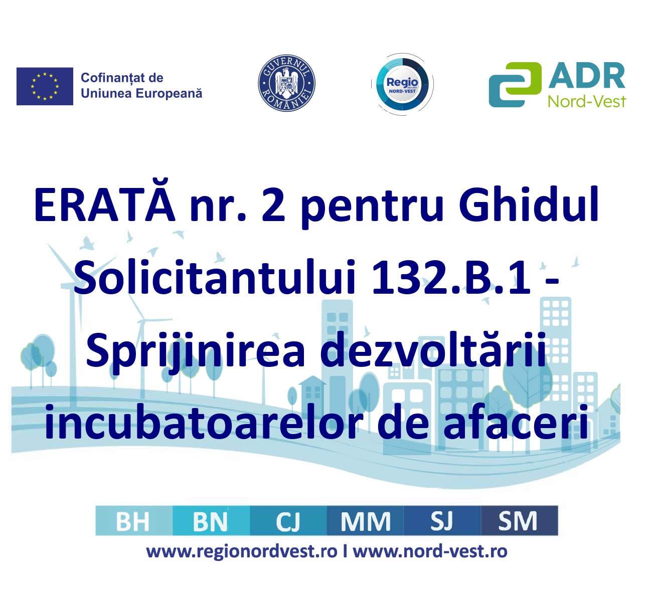 Autoritatea de Management pentru Programul Regional Nord-Vest 2021-2027 (REGIO Nord-Vest) emite ERATĂ nr.2 pentru Ghidul Solicitantului 132.B.1 – Sprijinirea dezvoltării incubatoarelor de afaceri, documentele consolidate cu anexele aferente și sinteza modificărilor sunt disponibile la adresa de mai jos: